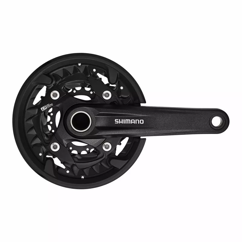Juego de bielas para MTB. Incorporan el eje integrado, de 24 mm (sistema standard Shimano). Se ofrecen con distintas opciones de desarrollos de platos. Se recomienda su empleo en sistemas de cambio de 9 velocidades.