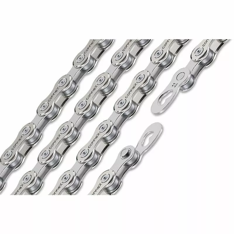 La cadena 11SX cumple con todos y cada uno de los requerimientos del ciclista. El pin de acero inoxidable y el novedoso recubrimiento de níquel de alto grado hacen de ésta una cadena extremadamente resistente a la corrosión. Combinado con la específica geometría de placas Connex, que hace que los cambios sean suave y fluido, y con un peso muy bajo, tenemos una cadena perfecta para los ciclistas más exigentes.