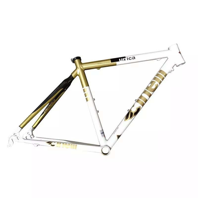 Cuadro Cinelli Unica Gold del año 2008, en talla 50, para bicicleta de carretera. Fabricado con tubos Columbus de alta gama, tirantes con acabado en carbono y geometría Pro Team Slope. Incluye cierre de sillín y patilla de cambio.