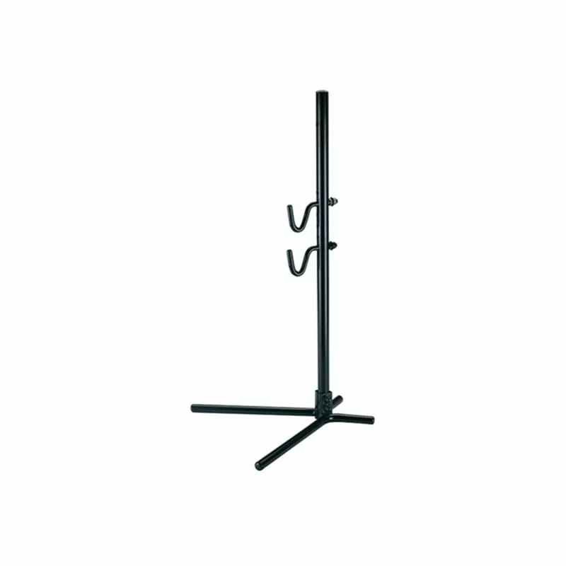 El soporte de bicicleta a la vaina es un dos en uno. Por una parte es un expositor para la bicicleta. Por otra parte, al permitir el giro de los pedales y la rueda trasera, sirve como soporte para hacer ajustes en la bicicleta. Estable, sencillo y minimalista.