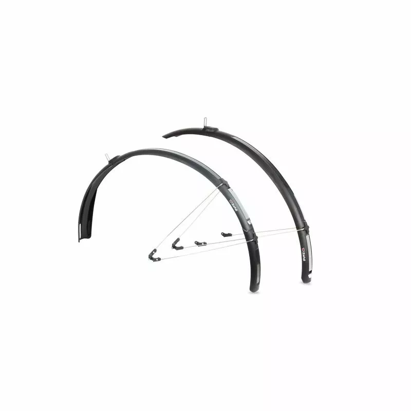 Set de guardabarros de varillas, adaptables a bicicletas urbanas, híbridas o mixtas que incorporan los ojales específicos en cuadro y horquilla. Ofrecen una protección óptima ya que cubren totalmente la rueda y en una posición mucho más cercana que los guardabarros flotantes. Las varillas son de tipo U para mejorar la estabilidad. El guardabarros trasero incorpora una prolongación en la parte derecha para proteger mejor el desviador de platos.