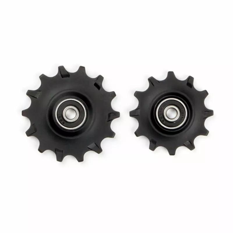 El set de roldanas de Elvedes es compatible con cambios SRAM con poleas de dos tamaños (12 y 14 dientes). Ambas incluyen rodamientos en el interior, mejorando claramente la fluidez en el movimiento de la cadena con respecto a las roldanas de cambio originales que incluyen de serie los cambios de gama media y básica de SRAM y otras marcas.