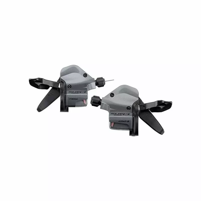 Set de mandos de cambio específicamente diseñados para bicicletas de carretera de manillar plano. Incluyen mando izquierdo para 2 platos y mando derecho para 8 velocidades.