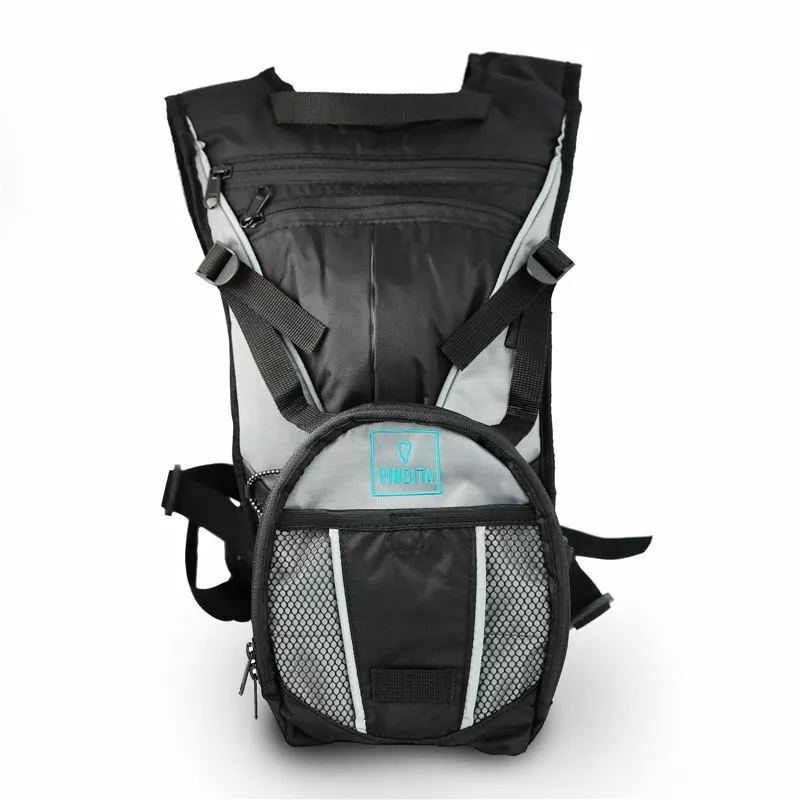 Mochila de hidratación con varios compartimentos. Incorpora una bolsa de agua de 1,5 L. Con bolsillos frontales y laterales. 4 correas de sujeción, a los hombros y a la cintura.