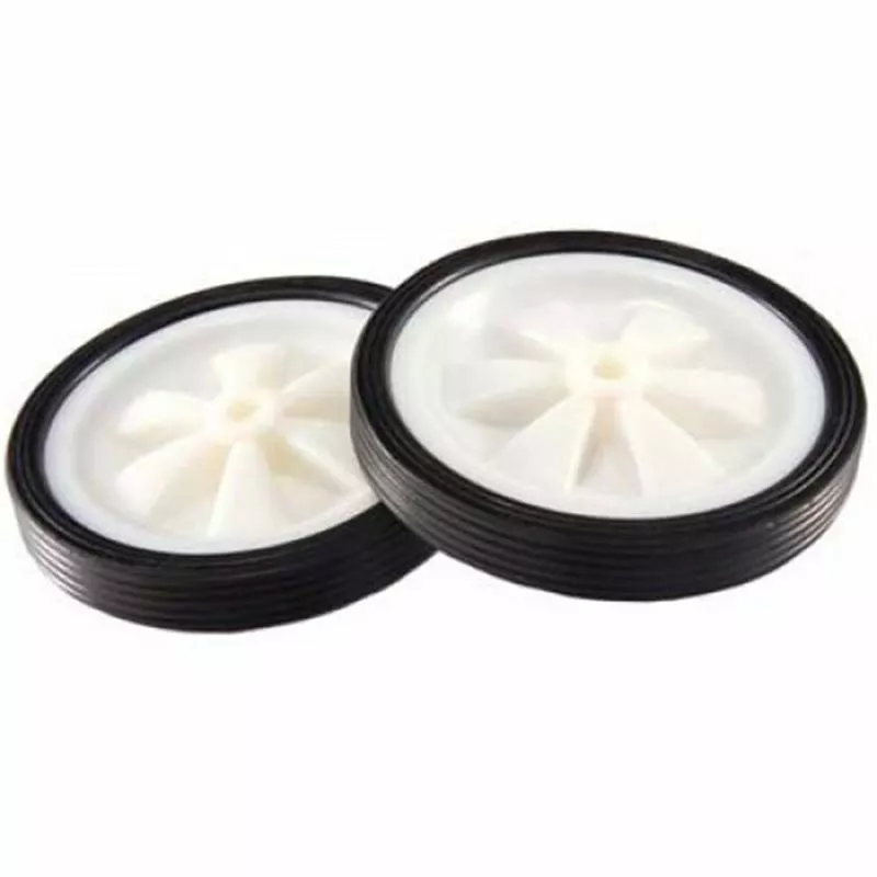 Par de ruedecillas de tipo universal que sirve de repuesto a las ruedas que vienen de serie en la mayoría de estabiciclos. Diseño sencillo y limpio, sin rodamientos.