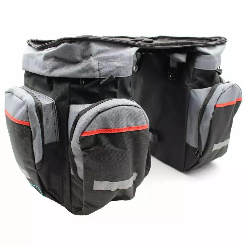 Set de alforjas de tres cuerpos. La bolsa superior es desmontable mediante una cremallera y se convierte en mochila. La mochila tiene sujeción óptima para el cuerpo, y ofrece un almohadillado cómodo y transpirable. Por su parte, los cuerpos laterales llevan bolsillos con cremallera. De montaje rápido, son universales y adaptables a cualquier portabultos.